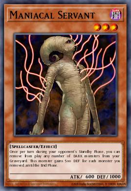 Một lần mỗi lượt trong Standby Phase của đối thủ, bạn có thể loại bỏ bất kỳ số lượng quái thú DARK nào khỏi Mộ của bạn. Quái thú này nhận được 500 DEF cho mỗi quái thú bạn loại bỏ, cho đến End Phase.